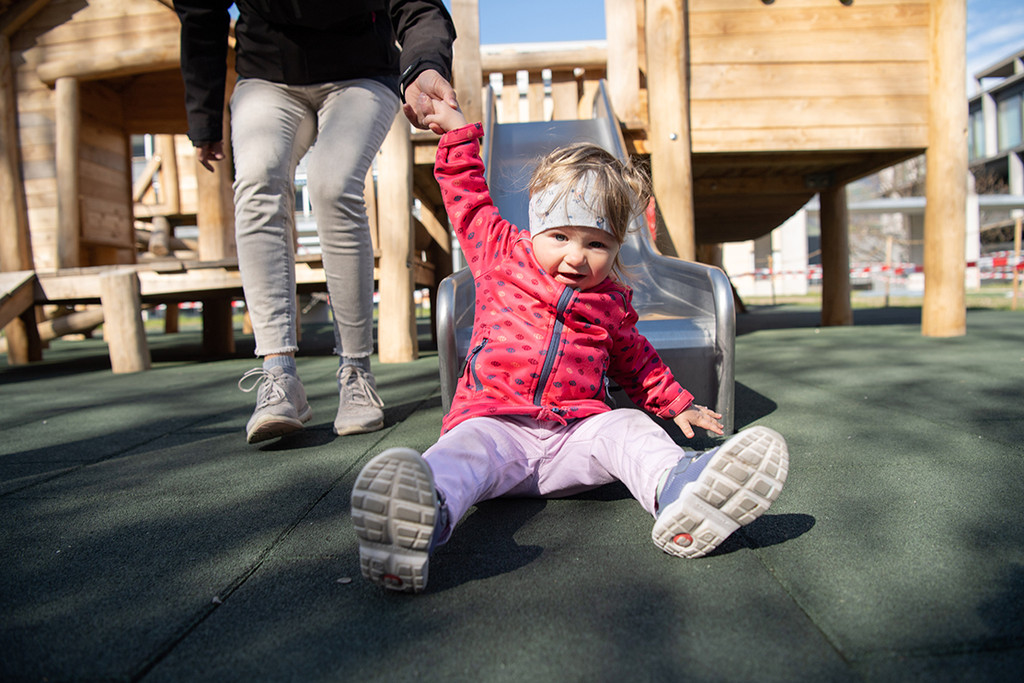 Wenn es nass und feucht ist oder Schnee liegt, ist vieles auf dem Spielplatz glitschig. Pass gut auf! Danke, dass du nicht aufs Dach kletterst!