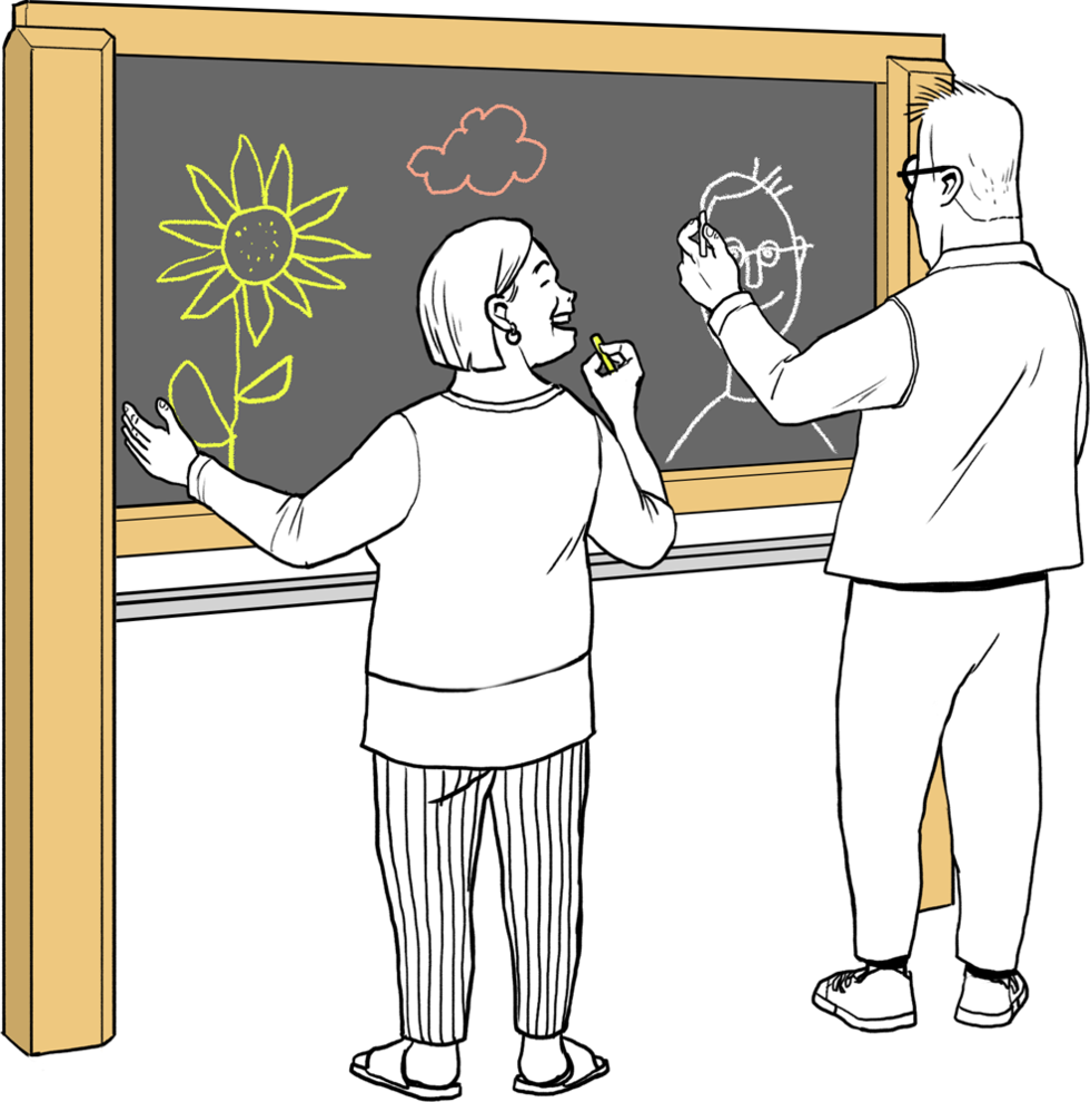 Wer eine besondere Herausforderung sucht, kann sich im beidhändigen Zeichnen versuchen. Dazu nimmt man in jede Hand eine Kreide und setzt sie zugleich auf der Tafel auf, um dann mit synchronen Bewegungen die gleichen freien Linien und Muster zu zeichnen. Am Ende können die Bilder auch in der Gruppe betrachtet werden: Welche Linien, Muster und Formen sind entstanden? Lassen sich die Bilder spiegeln? Welche Seite ist ausdrucksstärker? Diese Übung bietet einen schönen Überraschungseffekt, wenn die Teilnehmerinnen und Teilnehmer merken, dass sie tatsächlich mit beiden Händen zeichnen können.