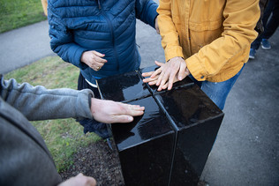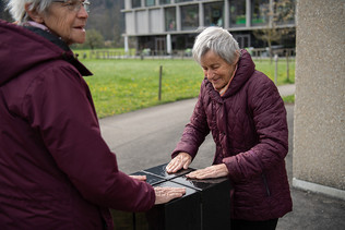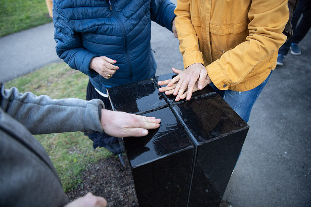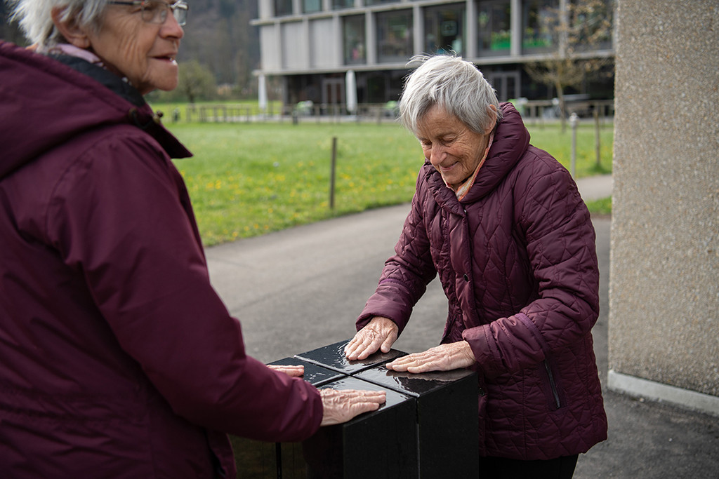 Nicht nur die Augen, sondern auch die Ohren nehmen besonders viele Sinneseindrücke auf. Wie viele reizvolle Klänge jedoch durch das Anschlagen eines Steines erzeugt werden können, ist nur Wenigen bewusst. Das Ohr hilft uns, die unsichtbaren Eigenschaften des Steins wie Härte, Masse und Elastizität zu «sehen». Der Stein ist bis auf ungefähr zwei Drittel seiner Höhe eingeschnitten. Die aufgeteilten Quader können in Schwingung gebracht werden. Dazu muss der Stein mit etwas Wasser benetzt und dann gefühlvoll, aber kräftig gerieben werden. Das bedarf einiger Versuche und etwas Übung.