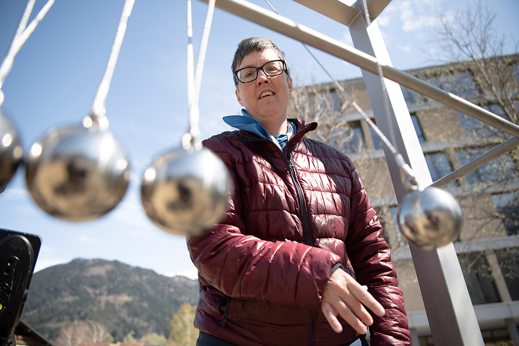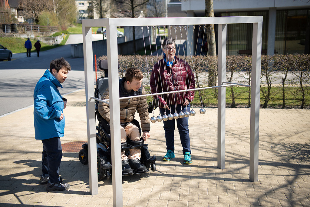 Mit den Impulskugeln werden die Gesetzmässigkeiten von Elastizität und Energiegehalt unmittelbar erlebbar. Neun freihängende Kugeln sind so hintereinander angeordnet, dass sie sich berühren. Nimmt man die erste Kugel, um damit den anderen einen Impuls zu geben, so wird etwas Erstaunliches sichtbar: Die Stosskraft der einen Kugel wandert unsichtbar durch die ganze Reihe der anderen Kugeln hindurch. Die Erste findet ihren Gegenspieler in der Letzten, die aus der Reihe ausgelenkt wird, und mit nahezu gleicher Kraft auf die Reihe zurückfällt. Der Vorgang wiederholt sich so lange, bis die Energie aufgezehrt ist. So lassen sich mit einer oder mehreren Kugeln immer neue Varianten und Zahlenspiele in vielfältigen Rhythmen erzeugen.
