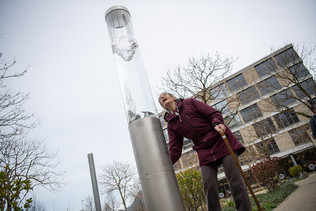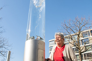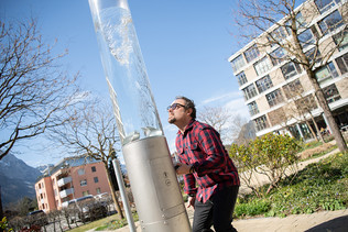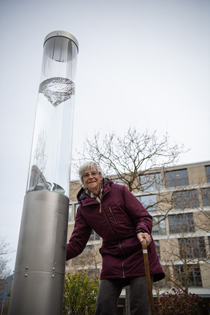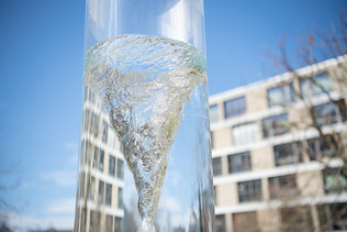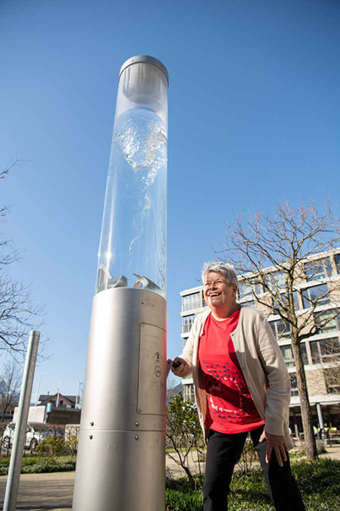 Betätigt man die Handkurbel, so lässt sich das Entstehen einer Strudelbewegung eindrucksvoll betrachten. Durch langsames Kurbeln steigt das Wasser zunächst am Rand des Zylinders entlang nach oben. Gleichzeitig bildet sich in der Mitte ein nach unten gerichteter Sog. Mit zunehmender Drehgeschwindigkeit entsteht schliesslich ein bis zum Boden hinab reichender Trichter, während der Gegenstrudel bis ganz nach oben steigt. Die beiden gegenläufig wirkenden Kräfte werden als rotierende Spiralen sichtbar, die das Wasser nach unten saugen und nach oben treiben. So erzeugt der Strudel seine eigene Gegenbewegung.